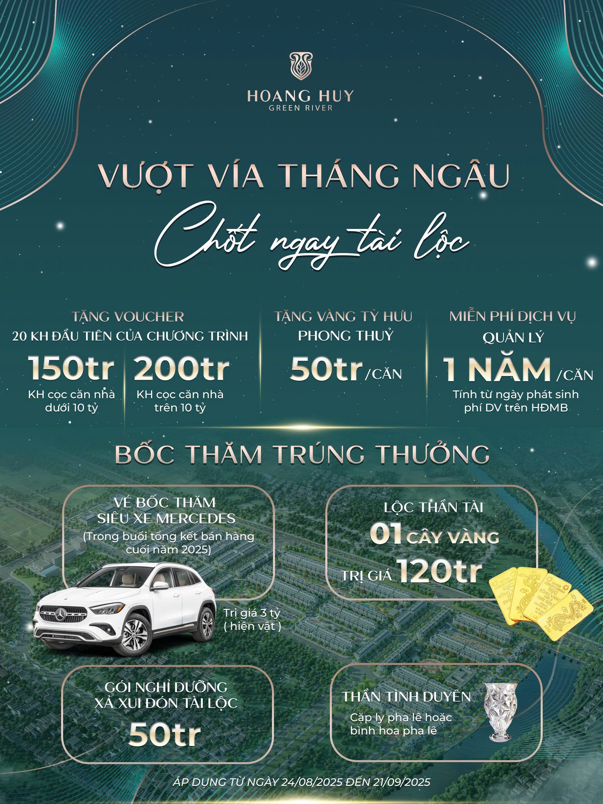 Ngoài ra, mỗi khách hàng mua nhà tại dự án Hoàng Huy Green River trong tháng ngâu có cơ hội gặp gỡ chuyên gia phong thủy hàng đầu Việt Nam và được tham gia sự kiện bốc thăm trúng thưởng với nhiều gói quà tặng hấp dẫn: - Gói bùa may mắn: Tặng ngay một vé bốc thăm sở hữu siêu xe Mercedes lên tới 3 tỷ đồng trong buổi tổng kết bán hàng năm 2025 (hiện vật)